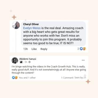 Create transformative experiences through weekly coaching calls and individual coaching; including hot seat coaching, aka your chance to be coached by us at the moment.